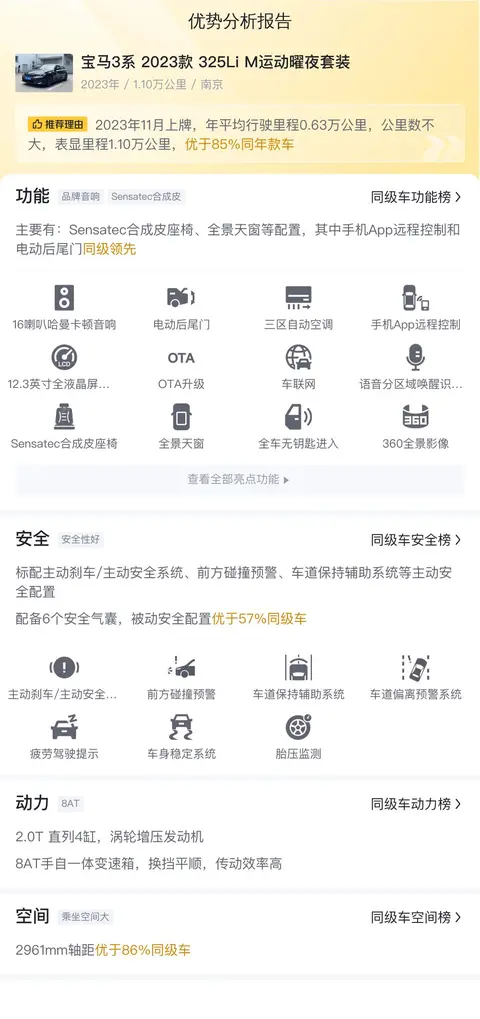 综上所述,这款宝马3系 2023款 325Li M运动曜夜套装无论是从外观造型还是内部配置来看,都表现得较好。而且车身较新,里程只有1.1万公里,内饰深色,外观黑色,保养不错,同时定价合理,只要22.9万,就可以上手。