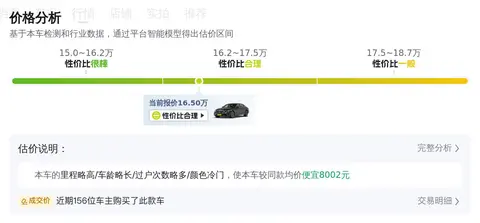 接下来,我们来看一下这辆车的市场行情。根据懂车帝的数据,这辆车的售价在14.98万至18.67万之间较为合理,而目前16.5万的定价处于适中的水平。在保值率方面,该车的保值率为38.92%,略高于同级车的平均水平34.61%。这表明即使在二手车市场上,这辆车也具有相对较好的价值保留能力。