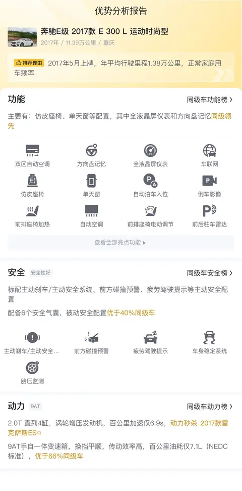 在众多二手车中,为什么这辆奔驰E级 2017款 E 300 L 运动时尚型能够吸引人的眼球呢?首先,它搭载了一台2.0T直列4缸涡轮增压发动机,百公里加速仅需6.9秒,这样的动力表现超越了2017款雷克萨斯ES。其次,它配备了9AT手自一体变速箱,不仅换挡平顺,而且传动效率高,百公里油耗仅为7.1L(按NEDC标准计算),这一成绩优于66%的同级别车型。再者,车内配备了全液晶屏仪表和方向盘记忆等功能,其中全液晶屏仪表和方向盘记忆更是同级别中的领先配置。最后,车内仿皮座椅、单天窗等配置为乘客提供了舒适的乘坐环境。可以说,这辆车在动力、油耗、配置等方面都有着不俗的表现,是二手车市场中的一颗璀璨明珠。