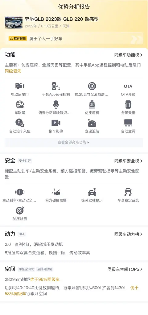 缺点:油耗偏高,美系车的油耗一直都不低,同级别车型油耗基本都在7L左右,而GLB的油耗则接近10L。变速箱顿挫,车主反映在低速行驶的时候,变速箱会有轻微的顿挫感,但不明显。隔音效果一般,胎噪明显,尤其是在高速行驶的时候,建议后期处理。奔驰GLB 2023款 GLB 220 动感型的价格主要还是因为奔驰品牌的影响力,作为家用来说,还是美系的XT5更加实用,但是价格却相差不大,所以性价比不高。