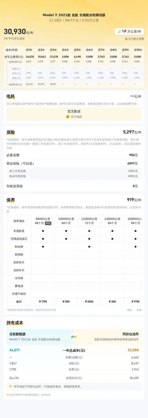 据估算,Model Y 2021款 改款 长续航全轮驱动版的用车成本是6910元/年,可以说用车成本不算高。