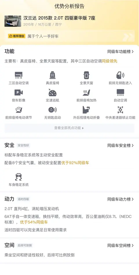 好了,现在让我们来看看这位靠谱大哥的市场价格吧!根据懂车帝的数据,这款二手汉兰达2015款 2.0T 四驱7座豪华版的市场价格区间在10.85-13.81万元之间。而咱们今天介绍的这位“壮硕绅士”,它的售价可是低出了均价哦!而且,根据懂车帝的数据分析,从保值率、功能配置和安全性三个方面来看,这款车子的表现都非常不错哦!再结合这辆车10年3个月的车龄、16万公里的里程、0次过户记录,综合状况良好,是一辆值得考虑的好车哦!