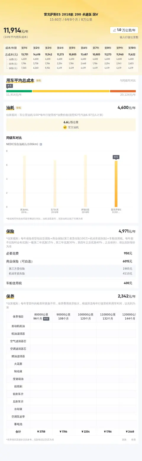 另外,同级车的最低10年平均用车成本是11327元/年,最高是20106元/年,雷克萨斯ES 2018款 200 卓越版 国V是12131元/年,适中的水准,优势不明显。