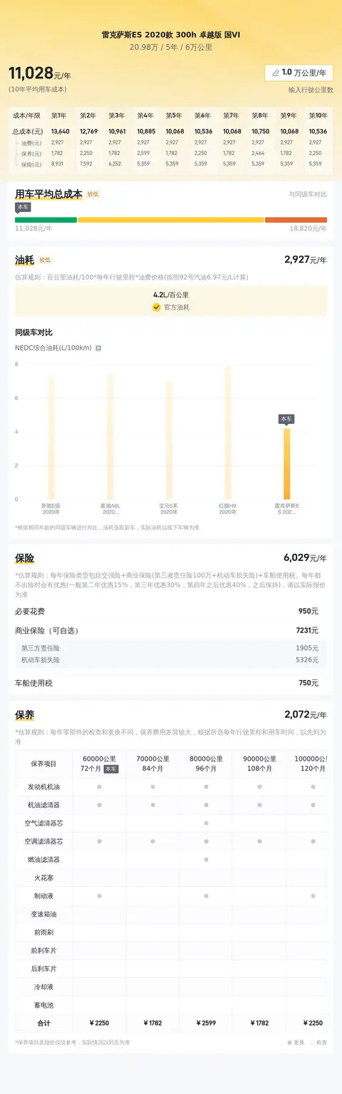 雷克萨斯ES 2020款 300h 卓越版 国VI的6年平均用车成本约为11473元/年,这一数字在同级别车型中处于合理范围内。保险费用、保养费用和油耗支出均保持着相对平衡的状态,长期使用也不会带来过重的经济负担。