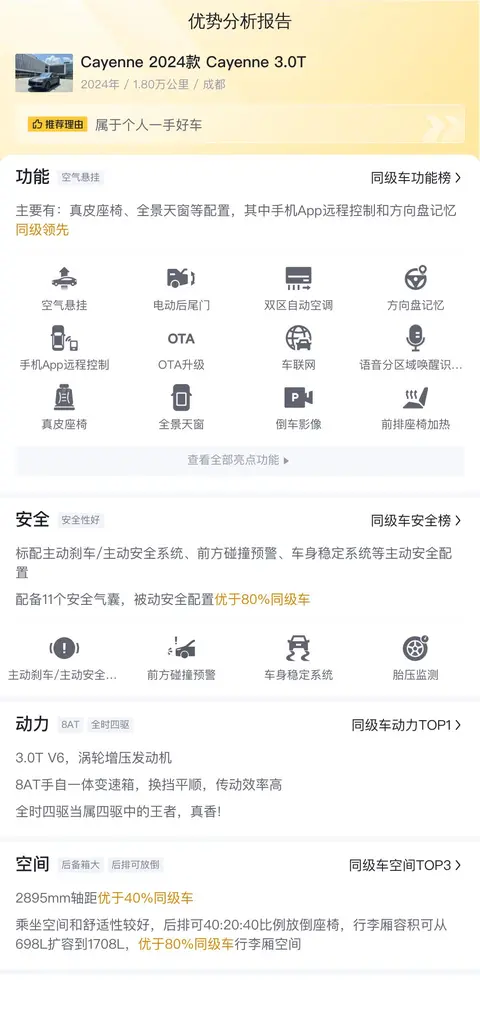 最后,我们来做一个简单的总结。如果你正在寻找一辆既能满足你对速度和激情的追求,又能为你提供豪华舒适的驾乘体验的SUV,那么保时捷Cayenne绝对是一个不错的选择。当然,作为一款豪华SUV,它的售价自然也不菲。相比之下,现在向您推荐的这辆二手保时捷Cayenne就显得更加诱人了。车况良好、性价比高,如果你刚好需要这样一款SUV来提升你的生活品质和社交形象,那么它绝对值得你考虑!