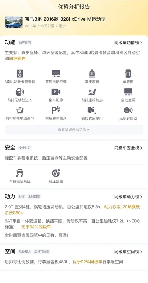 这辆2016款宝马328i xDrive M运动型轿车,已经行驶了15万公里,上牌时间为2016年6月,有过1次过户记录。车源位于南宁,牌照也是南宁本地,符合国IV(国V)排放标准。该车新车指导价为47.4万元,现二手车报价为10.5万元。