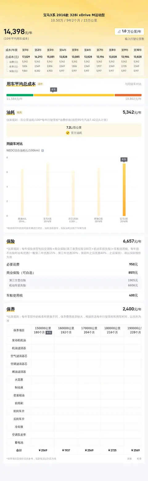 根据估算,这辆2016款宝马328i xDrive M运动型的年均综合用车成本大约为1.4万元左右,实际费用支出会因个人驾驶习惯、用车频率等因素有所差异。