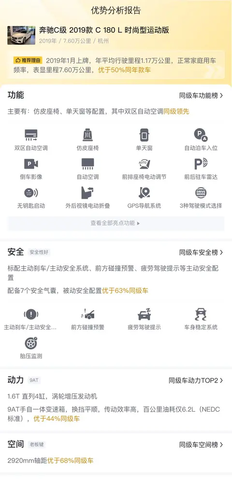 这辆奔驰C级 2019款 C 180 L 时尚型运动版的优势还是很明显的,毕竟是原价三十多万的豪车,安全配置给的很到位,配备了7个安全气囊、主动刹车/主动安全系统、前方碰撞预警、疲劳驾驶提示等主动安全配置,空间够用,2920mm轴距优于68%同级车,行李厢容积488L,优于78%同级车行李厢空间。另外,这车的坏路适应性非常好,得益于优异的底盘质感和良好的滤震效果,即便是经过一些颠簸路面,车内乘客也能保持较为舒适的坐姿,不会受到过多的摇晃和颠簸干扰,非常适合经常长途出行或者对乘坐舒适性要求较高的用户。