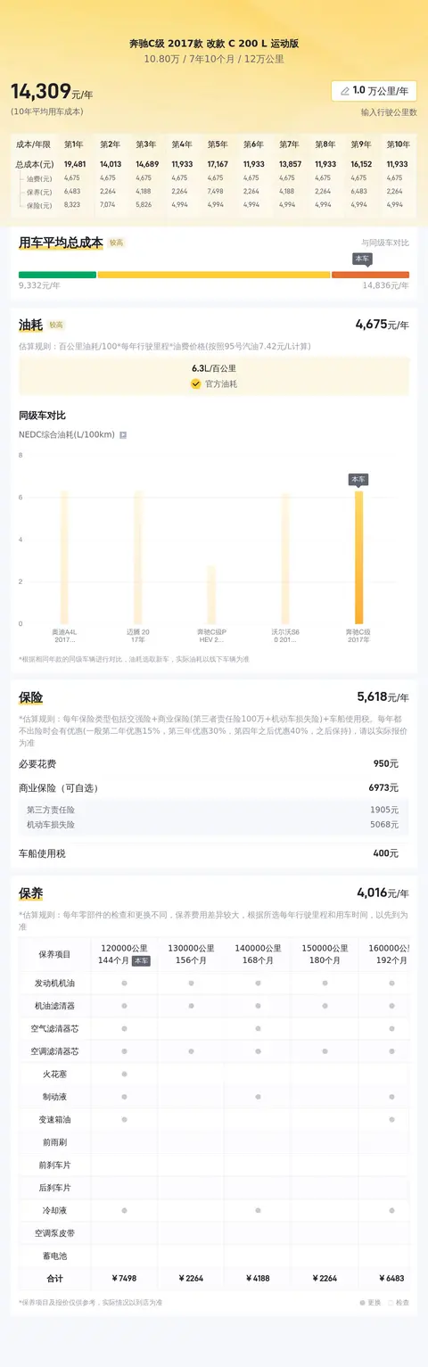 在经济性部分,我们也为您调研了一下这辆车的用车成本,方便您全面的了解这款车。这辆奔驰C级官方公布的综合油耗为6.3L/100km,按照每年行驶一万公里里程计算,燃油费用约为5087元,年度商业保险约4758元,每年保养费用约4066元,平均年度用车总成本约13911元,用车成本在同级别竞品车型中处于较高位置,这点您买车的时候需要综合考虑一下。