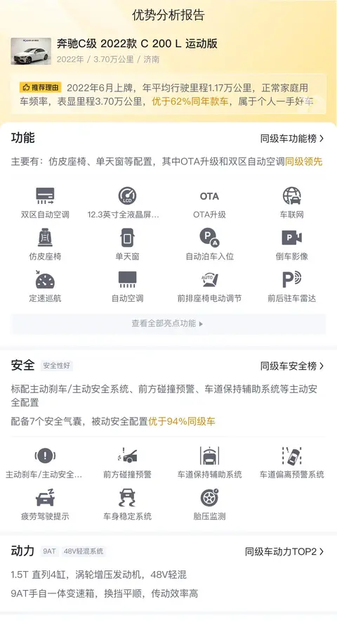 这辆奔驰C级2022款 C 200 L 运动版车源地和上牌地均为济南,2022年6月上牌,至今未有过过户记录,3年多的时间里行驶了3.7万公里,家用车的话这个数字很适中。国VI排放标准,全国通行无障碍。外观为白色,内饰为深色,搭配起来比较经典。这车当时的新车含税价是35.53万,现在二手车报价19.38万,比新车便宜16.15万,首付5.81万就能开回家。