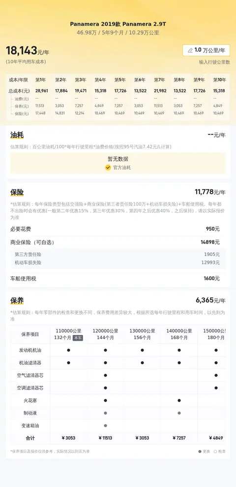 据估算,这辆Panamera 2019款 Panamera 2.9T的用车成本是23601元/年,毕竟动力摆在那里,所以油耗什么的肯定也不低,能有这个用车成本也算正常。