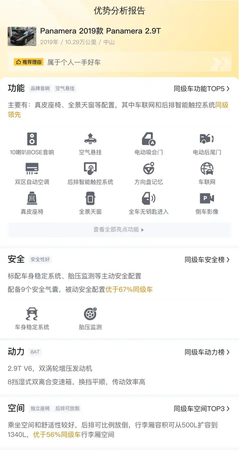 优势:Panamera 2019款 Panamera 2.9T的市场行情价是46.37万-56.54万,它的报价则是46.98万,报价偏低,还是有优势的。同时保值率高,0过户,所以综合性价比还不错。品牌溢价高,实力出众,无论是驾驶操控,还是乘坐舒适性都出自一流。空间大,可以作为商务用车,也会很体面。
