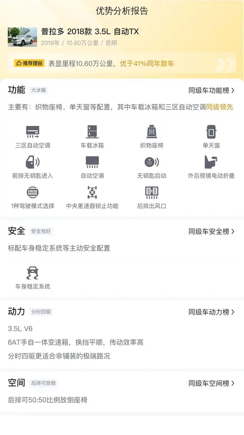 在功能配置方面,这款普拉多配备了织物座椅、单天窗等配置,其中车载冰箱和三区自动空调同级领先。关于这一点,我们也将通过图表向您展示这款车在功能配置方面与同级别竞品车型的对比情况。