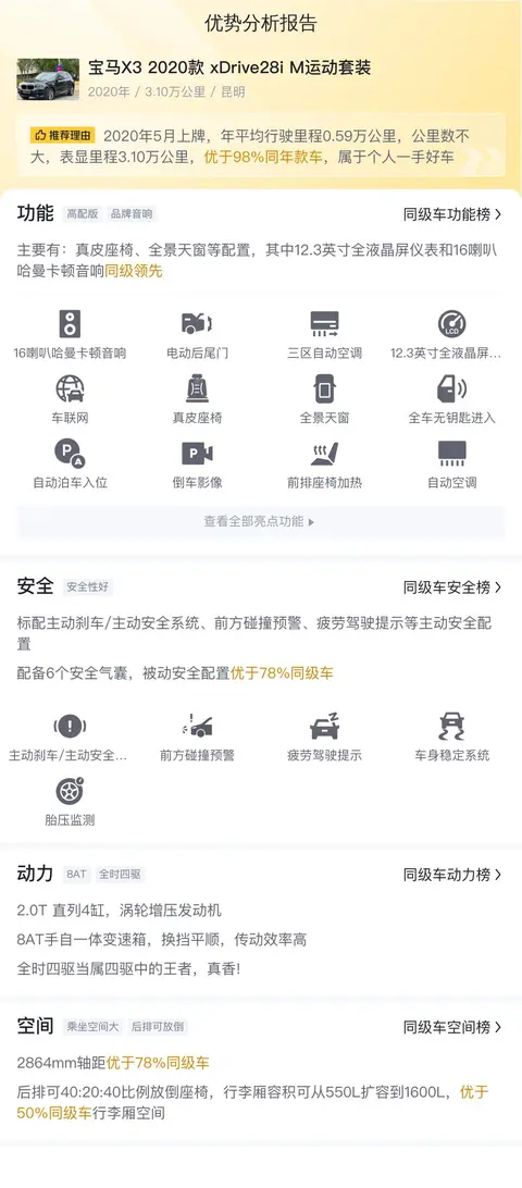 另外,同级车的最低10年平均用车成本是12465元/年,最高是17771元/年,而这辆宝马X3 2020款 xDrive28i M运动套装是15681元/年,所以用车成本属于适中的水准。