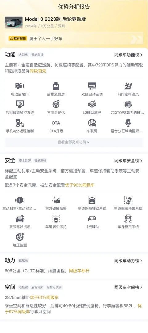 总结说一下,这辆车是2024年的车,到现在也就一年多车龄,开了3万公里,年均行驶里程0.5万公里,低于正常家庭用车频率,用车成本较低,而且未过户,属于一手好车源。这辆车通过了重大事故检测,整体车况没有大问题,外观有1处瑕疵,属于正常使用损耗,不影响使用。这辆车最大的亮点还是来自于车型本身,特斯拉品牌知名度高,市场保有量大,后期维保费用低,品牌溢价能力较强,后期还有一定的残值。如果您正好想买这个车型,那这辆车值得您考虑。