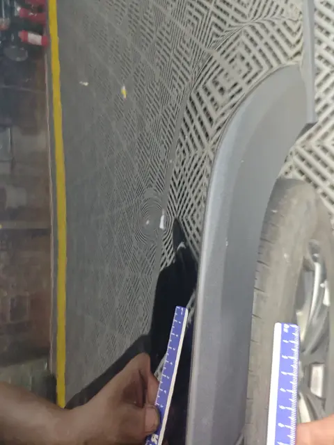 左后翼子板有瑕疵,看不清具体状况,需查看实物,瑕疵可能是划痕、划伤、凹坑等,轻微瑕疵不影响正常使用,洗车时注意清理凹坑处的污垢即可。