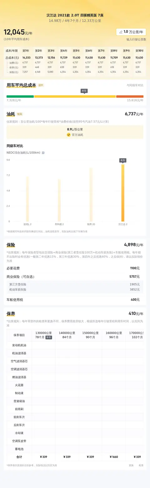 据估算,汉兰达 2021款 2.0T 四驱精英版 7座的用车成本适中,因为它的用车成本是12535元/年,同级车最低用车成本是11468元/年,最高用车成本是13842元/年。