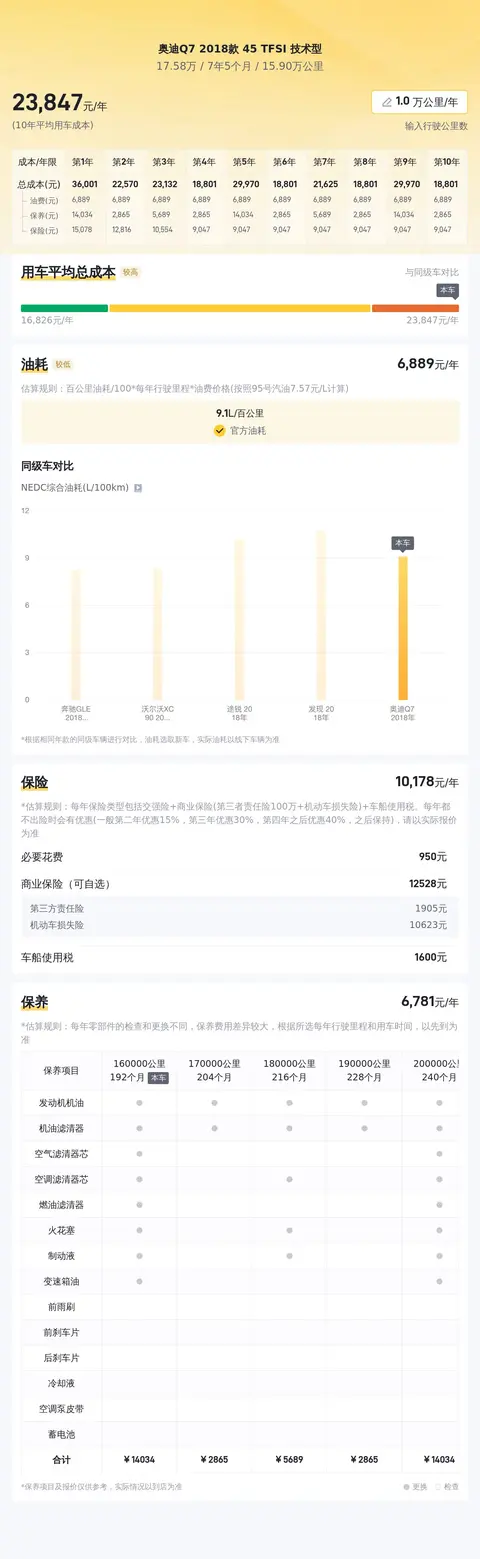 据估算,同级车的最低用车成本是17178元/年,最高是24678元/年,奥迪Q7 2018款 45 TFSI 技术型是23688元/年,所以用车成本不算低。