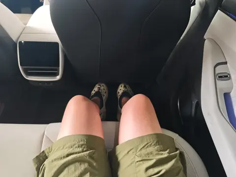 大家最关心的应该还是后排空间问题,毕竟之前小米SU7就是为了好看的造型牺牲了后排体验。腿部空间没问题,座椅厚度和宽度都非常不错,513mm的宽度能完成承托住我的大腿,坐垫有一定程度的上翘但是幅度并不算很大。前后排之间留出的空间也足够大,哪怕你是个大长腿,还可以把脚伸进前排的下方。
