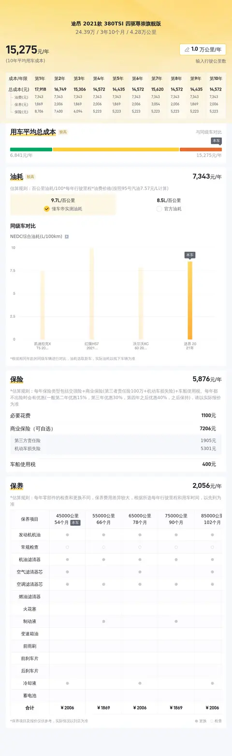 如上图所示,在60个月期内,这款车的最低10年平均用车成本为14678元/年,最高10年平均用车成本为16308元/年,具体用车成本金额与车主的实际使用情况有一定关系。