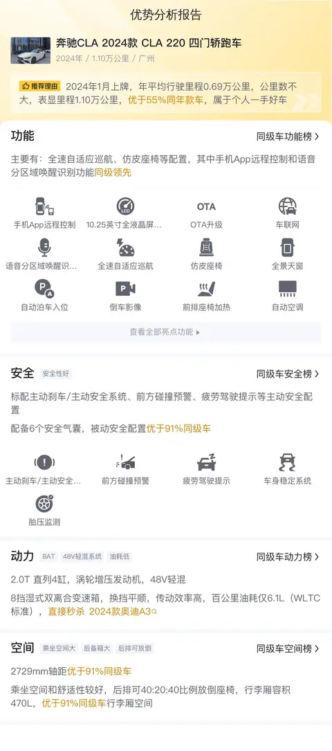 综合来看,如果您正在寻找一款时尚豪华、性能出色的二手轿跑车,那么这辆二手奔驰CLA 2024款 CLA 220 四门轿跑车绝对是一个值得考虑的选择。它的外观时尚动感,内饰豪华精致,动力性能出色,安全配置全面。虽然价格相对较高,但其卓越的性能和舒适的驾乘体验无疑让它物有所值。如果您不介意后排空间和行李舱容积方面的相对局限,那么CLA 220将为您带来一次难忘的驾乘体验。