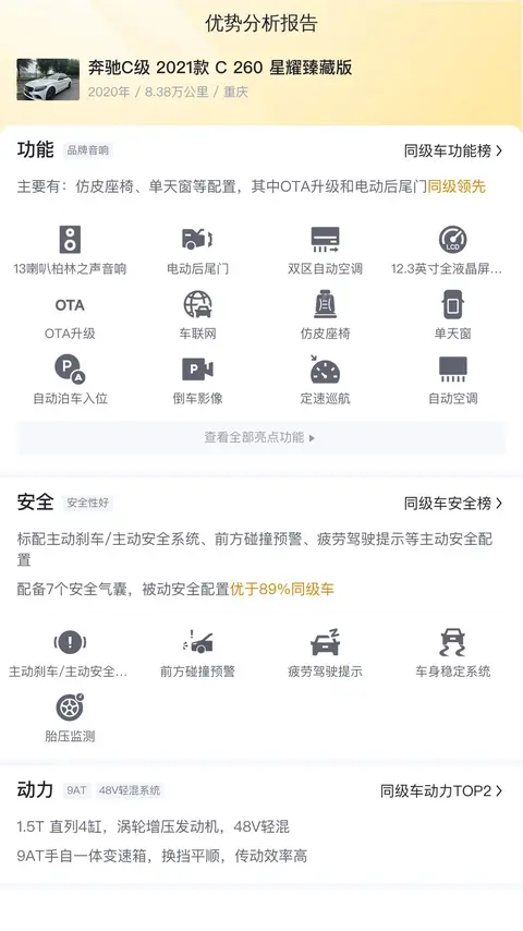 综上所述,这辆二手奔驰C级在车况、用车成本、特色配置以及市场行情等方面均表现出色。它不仅拥有引人注目的外观和舒适的内饰,而且在动力、安全和智能互联等方面也毫不妥协。无论是日常通勤还是周末出游,它都能为您提供卓越的驾驶体验和舒适的乘坐感受。如果您正在寻找一辆高品质的二手车,那么这辆奔驰C级绝对是一个值得考虑的选择。