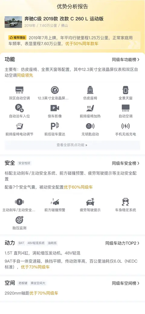这台二手奔驰C级2019款改款C260L运动版上牌地为广东省佛山市,上牌日期2019年7月,表显里程7.60万公里,白色车身深色内饰,过户次数1次。新车指导价34.68万,本文撰写时该车二手车报价14.38万,约6.6折。