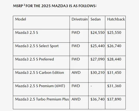 这次 26 款的北美马自达一共分 6 个版本,分别是:2.5 S、2.5 S Select Sport、2.5 S Preferred、2.5 S Carbon Edition、2.5 S Premium ( 6MT ) 和 2.5 Turbo Premium Plus。