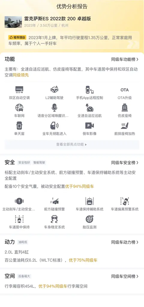优势:雷克萨斯ES2022款200卓越版的市场行情价是19.18万-22.97万,它的报价是19.58万,报价相对较低。同时它的保值率也较高,所以综合性价比相对较高。配置上,全速自适应巡航、座椅加热通风加热也能满足不同的用车需求。加上日系车的省油,后期用车成本不高。
