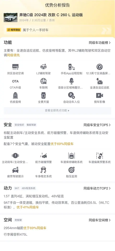 买二手车,配置要实用。这辆奔驰C级 2024款 改款 C 260 L 运动版配备了全速自适应巡航、自动泊车入位、L2辅助驾驶、4种驾驶模式可供选择、仿皮座椅等配置,其中L2辅助驾驶和双区自动空调同级领先。