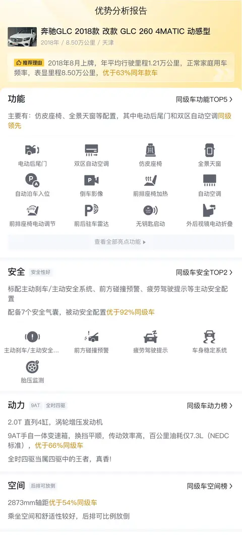接下来,我们聊聊这款车的用车成本。根据相关数据显示,这款二手奔驰GLC 2018款 改款 GLC 260 4MATIC 动感型的年均综合用车成本大约为1.57万元。这个数字涵盖了燃油消耗、保险费用以及日常保养等各个方面。值得注意的是,这款车的百公里油耗为7.3升(NEDC标准),这一数据在同级别车型中表现出色,意味着在燃油经济性方面,它能够为您节省不少开支。至于保险费用,根据预估,这款车的商业保险费用大约为5700元/年,这是一个相对合理的价位,能够为您提供充足的保障。最后,我们来谈谈保养成本。这款车的保养费用大约为3240元/年,这一数字再次凸显了奔驰品牌在售后服务方面的专业与周到。综合来看,这款二手奔驰GLC 2018款 改款 GLC 260 4MATIC 动感型不仅在车况与配置上表现出色,在市场行情与用车成本方面同样具备明显优势。如果您正在寻找一款性价比高、品质卓越的豪华SUV,那么这款车无疑是一个值得考虑的选择。