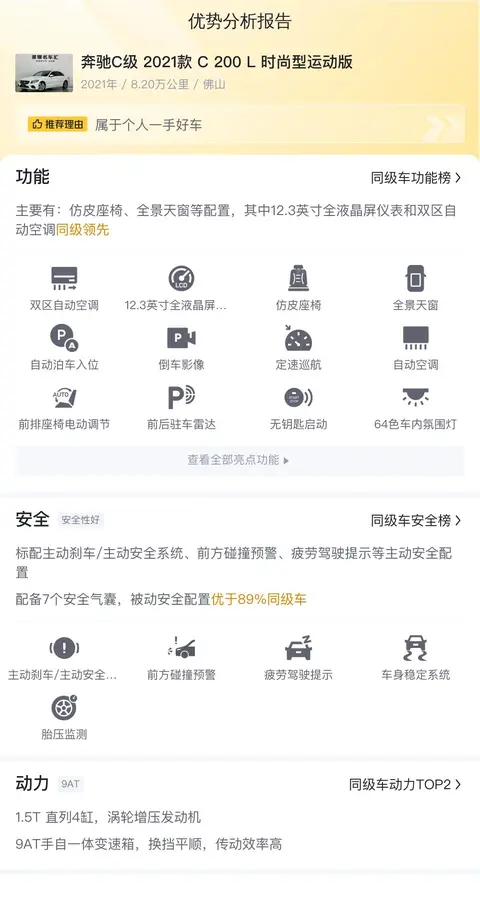 根据估算,这辆奔驰C级 2021款 C 200 L 时尚型运动版的用车成本不算低,因为它的用车成本是14380元/年,同级车最低是11469元/年,最高是16486元/年。但考虑到豪车的定位,这个成本也算合理。