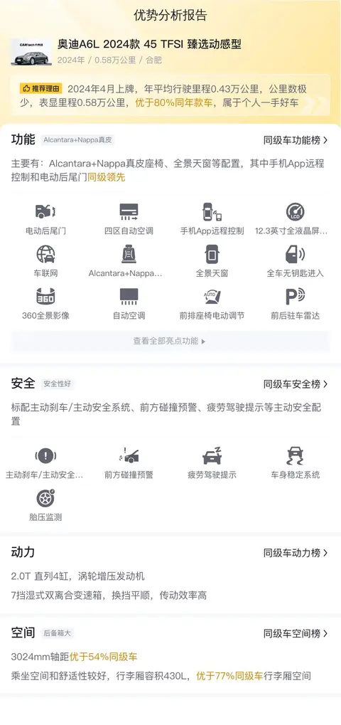 综上所述,奥迪A6L 2024款 45 TFSI 臻选动感型在配置、安全、空间、动力性能以及舒适性等方面均表现出色,是一款集豪华与实用于一体的中大型豪华轿车。如果你正在寻找一款既能满足日常出行需求,又能提升生活品质的车型,那么奥迪A6L 2024款 45 TFSI 臻选动感型无疑是一个值得考虑的选择。