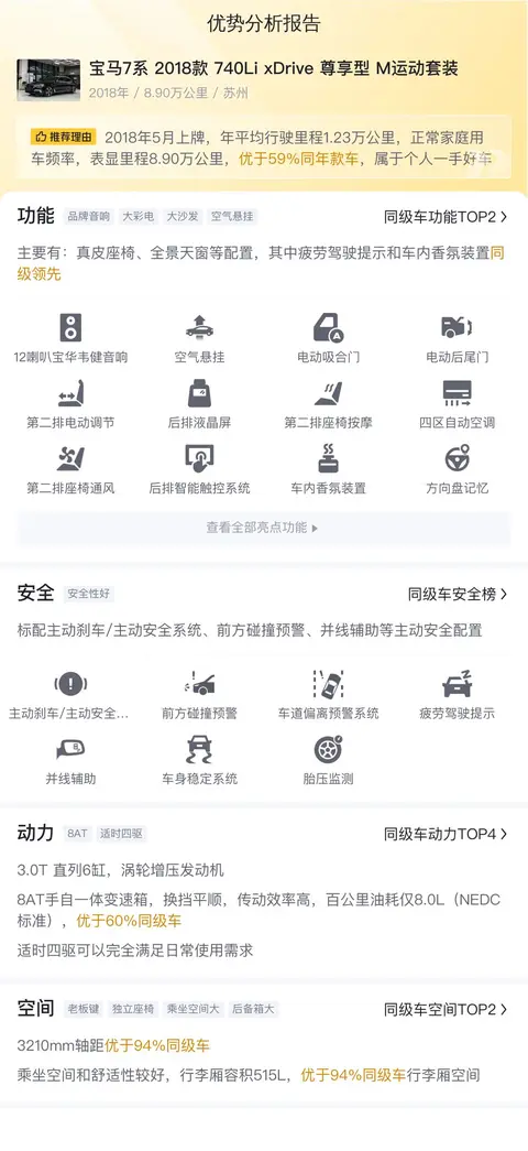 宝马7系2018款740Li xDrive尊享型M运动套装的10年平均用车成本是23255元/年,和同级别车相比处于适中水准。看到这儿咱车友可能就要发问了,车买回家以后的用车成本怎么样?开的时间长了会不会比别的同级别车型成本更高?这一块儿咱懂车帝也替咱车友想到了,同样是一样大数据分析,全国所有在售同款车型的用车平均成本明明白白的展示在咱车友面前,咱车友一眼就能看出来自己心仪车型的后期用车成本大体在什么水平,后期用车成本心里有底了,车嘛,不就图个省心省事儿?咱懂车帝这是真真切切的为咱消费者考虑呀!