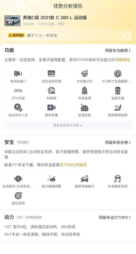 下面让我们一起了解下这辆二手奔驰C级的具体情况,该车具体版本是奔驰C级 2021款 C 260 L 运动版,它的定位是中型轿车,外观颜色为白色,内饰则是深色配色。该车的上牌地是贵阳,上牌日期2020年12月,表显里程是7.9万公里,新车指导价是34.68万,现在的二手车报价是15.88万,过户次数是0次。