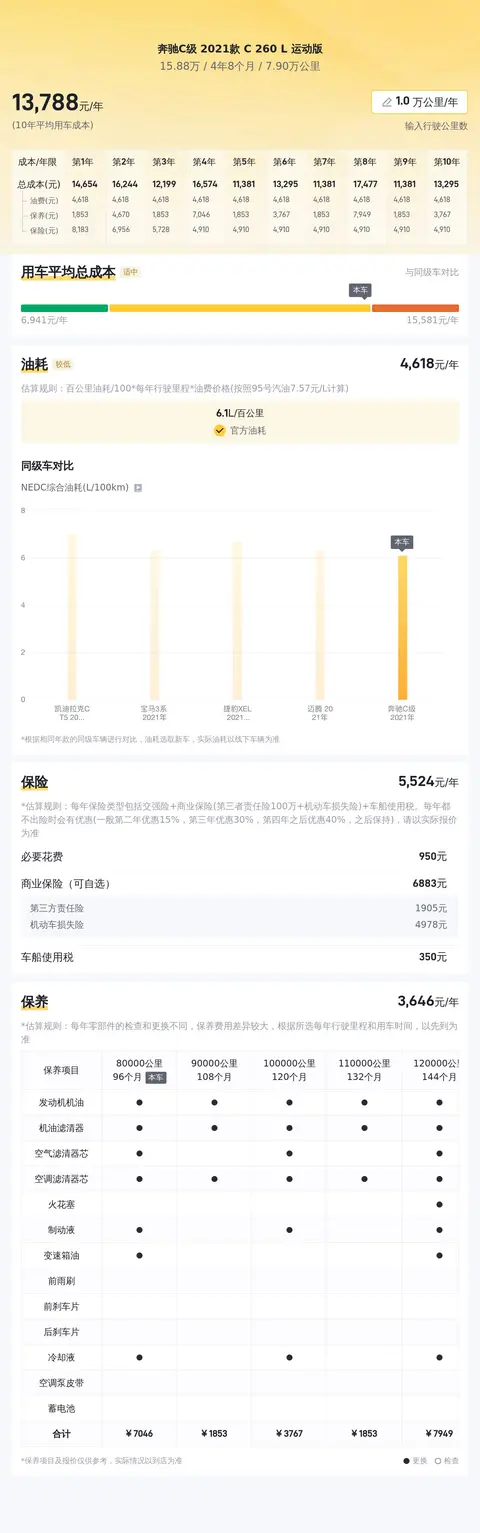 这款车的百公里油耗为6.1升,考虑到车辆的尺寸和动力性能,这一油耗水平属于合理范围。按照一年2万公里的行驶里程计算,每年的油费大约需要9664元。结合全国中型车平均用车成本来看,这款车的用车成本适中,并无明显优势。下面我们将通过图片的方式向您展示这款车大约需要多少用车成本。