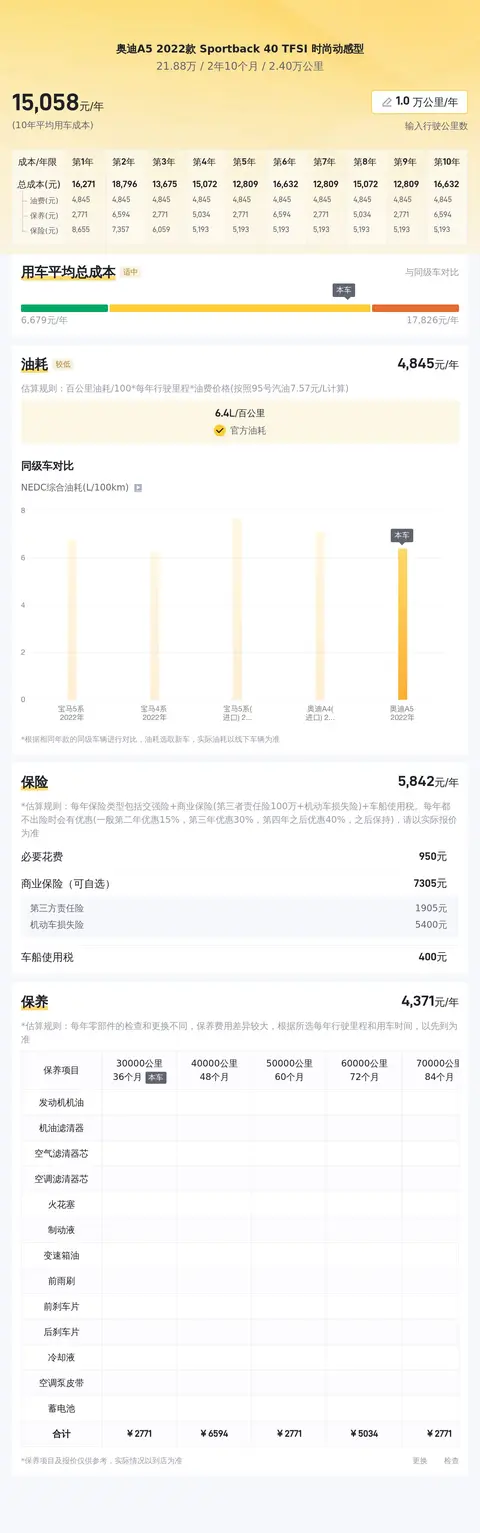 据估算,同级车的最低用车成本是6506元/年,最高是15788元/年,奥迪A5 2022款 Sportback 40 TFSI 时尚动感型是15178元/年,所以用车成本较高。