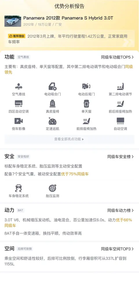 总结:在二手车市场中,车辆的实际情况千差万别。对于潜在买家而言,评估一辆二手车的价值时,新车价格、车龄、里程、过户次数、车况维护等诸多因素都需要被纳入考虑范畴。就本文所介绍的这辆二手保时捷Panamera而言,其新车指导价高达175.1万元,而当前的二手车报价仅为13.88万元,相较于新车价格便宜了161.22万元。这一价格降幅,无疑为那些梦想拥有一辆保时捷,但又希望在预算上有所控制的消费者提供了一个难得的机会。需要注意的是,该车未提供专业的第三方检测报告,因此潜在买家在做出购买决策之前,建议亲自查看车辆,详细了解车况。