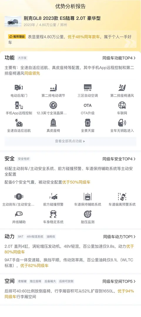 综上所述,在考虑购买这辆二手别克GL8 ES陆尊 2023款 2.0T 豪华型时,您可以重点关注以下几个方面:首先,其合理的价格提供了较高的性价比,特别是在考虑其良好的车况和适中的行驶里程时;其次,该车较低的WLTC综合油耗(8.08L/100km)以及适中的用车成本(约1.4万元/年),适合那些寻求经济高效用车体验的消费者;最后,作为一款受欢迎的MPV车型,它在空间、舒适性和功能性方面表现出色,适合家庭使用和商务出行。然而,在做出购买决策之前,建议您亲自查看车辆,确保其车况符合您的期望,并根据个人需求和预算做出最佳选择。