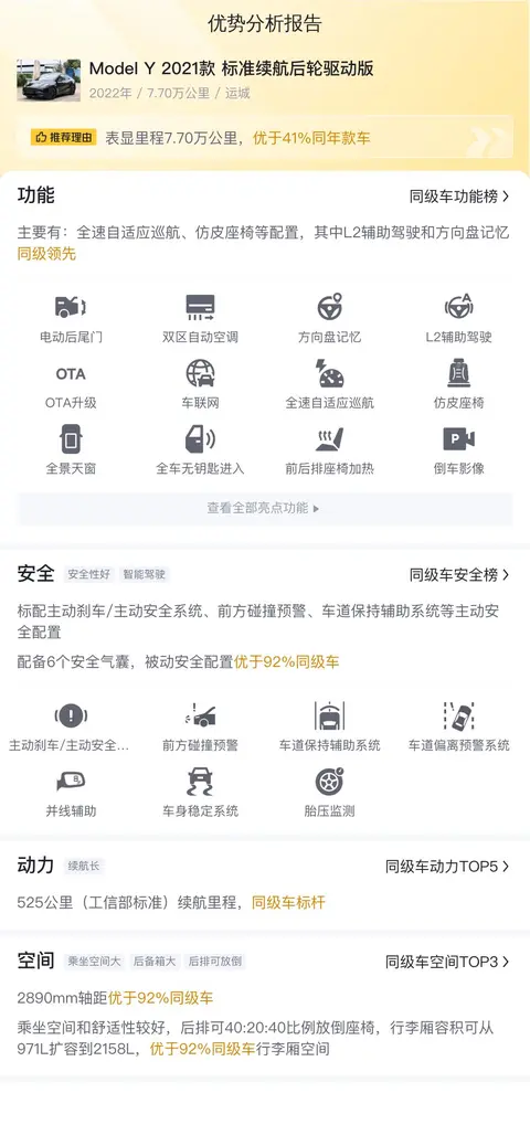 综上所述,这辆二手Model Y 2021款 标准续航后轮驱动版在性价比、配置和性能方面都有着不错的表现。但需要注意的是,作为一款早期的纯电动车型,它在技术层面可能不如新款先进。购买前还需充分考虑个人需求、预算以及未来的维护成本等因素。希望这篇文章能为您提供有价值的参考,助您做出明智的购车决策。