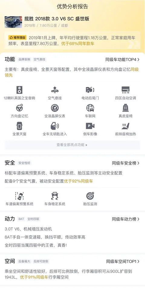 综上所述的新车含税价、用车成本、市场行情、优势分析、同款比价等数据仅供参考。在配置部分,因为二手车非标品,车辆可能会存在配置改装的情况,具体车况信息需要线下结合车辆实际情况进行综合参考。