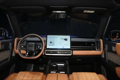 走进车内,整体布局简洁。配备内嵌式全液晶仪表和15.6英寸2.5K中控屏,车机系统采用高通骁龙8155芯片,还配有哨兵模式,中控台下方的把手增添了越野氛围。同时,新车配备平底式多功能方向盘、怀挡式换挡机构以及手机无线充电面板,座椅采用2+3式的5座布局。