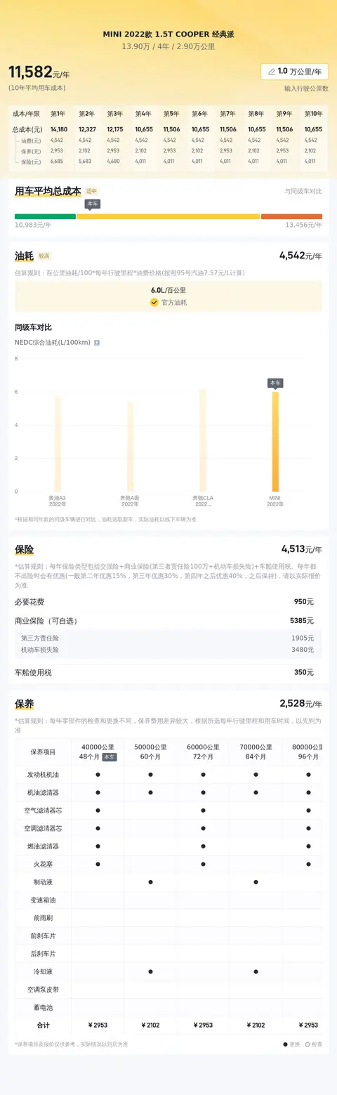 这辆MINI 2022款 1.5T COOPER 经典派啊,官方给出的百公里油耗是6.0L,按照每年行驶一万公里、每升油价8.01元来算,每年的油费大概是4806元。再来说说保险,交强险加上商业险(第三者责任险100万+机动车损失险),第一年的费用大概是4900元,不过啊,保险费会根据每年的理赔记录有所变动,如果您开车小心点,理赔记录少了,保险费自然也就省下了。接着是保养费用,按照每年行驶一万公里来算,每年的保养费用大概是1828元。除了上面说的油费、保险费和保养费用,可能还会有一些其他费用,比如停车费、洗车费、过路费等等,这些费用因人而异,但通常一年下来,预留个3000块左右应该够用了。综上所述,这辆二手MINI一年的用车成本大约是15370元,平均到每个月大概是1275元。