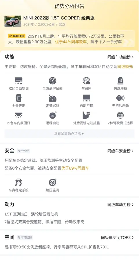 车况好的二手MINI可是个热门货,这辆MINI 2022款 1.5T COOPER 经典派报价13.9万,在市场价里属于中等水平,但它里程短,车龄新,车况就是新的,而且啊,它可是我们平台top5的热销车型,足见它的人气和性价比啦!