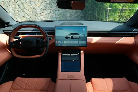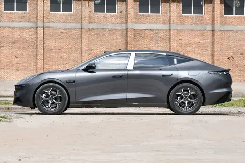来到车身侧面,隐藏式门把手不仅让车身线条看起来更加流畅,还能有效降低风阻,提升车辆的续航能力。21 英寸的大尺寸轮辋搭配 255/40 R21 的轮胎,霸气十足,而且抓地力强,过弯时给人十足的信心。当然,如果你更喜欢低调一些,它也提供 19 英寸轮辋可供选择。车身尺寸方面,长宽高分别为 5050/1966/1487 毫米,轴距达 3005 毫米,这样的尺寸在中大型轿车中表现优异,为车内营造出了宽敞的驾乘空间,无论是家庭出行还是商务接待,都不会让人觉得局促。