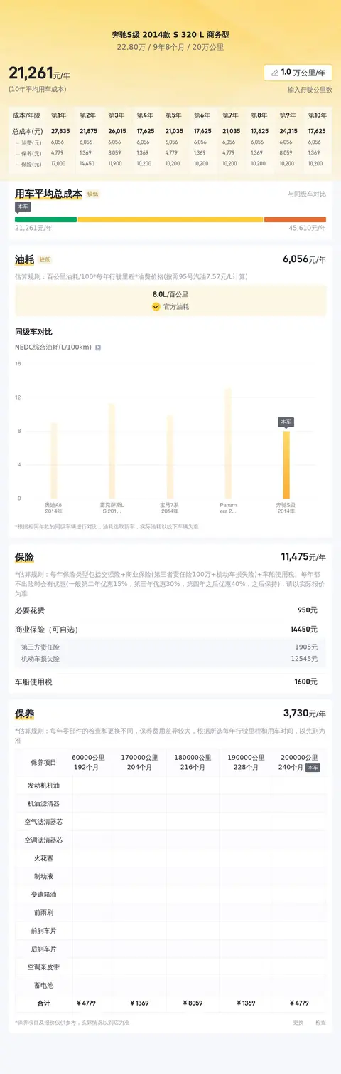据估算,同级车的最低用车成本是18798元/年,最高是43710元/年,奔驰S级 2014款 S 320 L 商务型是21055元/年,用车成本适中。