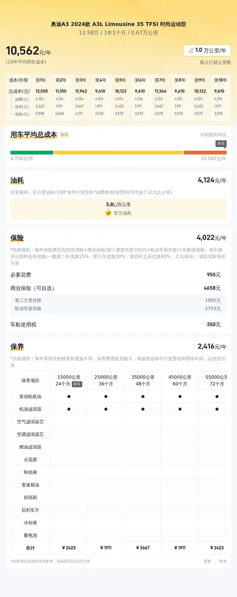 养车成本方面,该款车官方公布的百公里油耗为5.8(L/100km),按每年行驶一万公里里程计算,燃油费用约为5202元,年度商业保险约4380元,每年保养费用约1638元,平均年度用车总成本约11219元,具体费用要根据车辆实际使用情况而定。