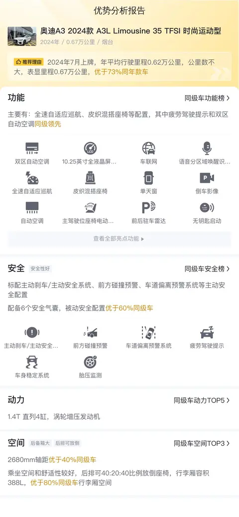 今天带来的这台奥迪A3 2024款 A3L Limousine 35 TFSI 时尚运动型,上牌地为山东烟台,上牌时间2024年07月,表显里程6700公里,车身颜色为白色,过户次数1次。新车售价24.53万,本二手车售价13.58万,近一年内奥迪A3在全国紧凑型轿车销量榜Top6,市场认可度较高,且本车系为高配车型,车况正常情况下性价比不错。