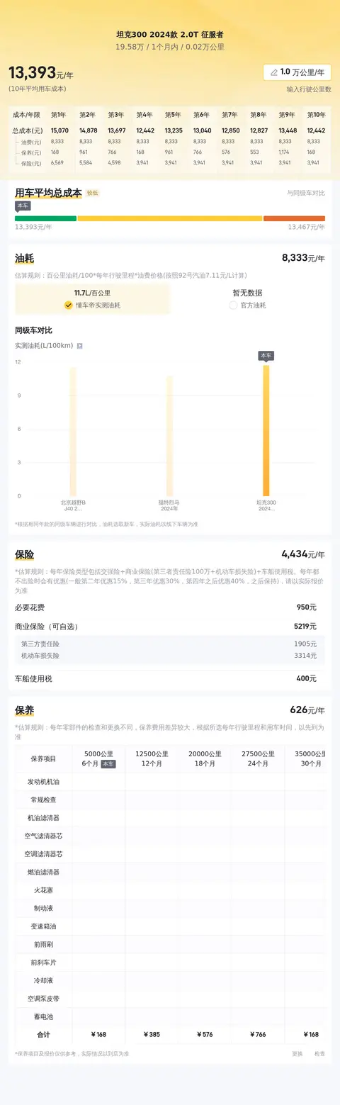 据估算,同级车的最低用车成本是12715元/年,最高是16736元/年,坦克300 2024款 2.0T 征服者是13333元/年,所以不算高。