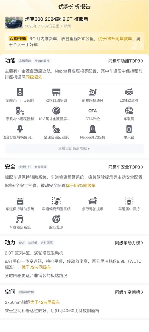 优势:坦克300的外观可谓是男女通杀,又酷又飒,谁看谁想开,甭管越野出去玩还是城市代步,开着这样一台车在路上的回头率还是很高的。这辆坦克300 2024款 2.0T 征服者是准新车,里程极短,0过户,基本就是一手新车的状态,入手更放心。并且售价低于新车价,却高过市场价,保值率很高,入手不亏。